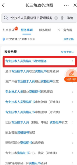 第三步:搜索服务事项“专业技术人员资格证书管理服务”。