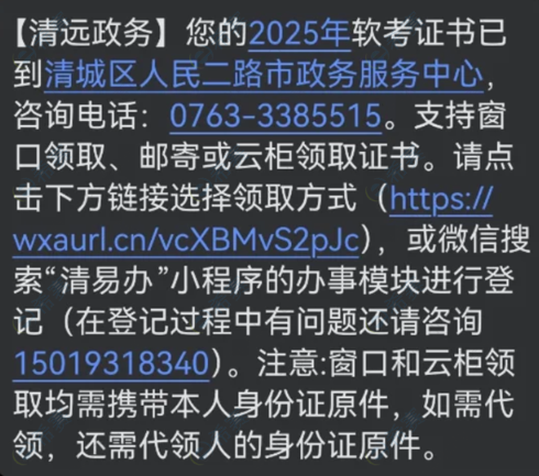 2025年上半年清远软考证书发放已开始,根据短信的内容:即日起(7月9日)清远2025上半年软考证书支持窗口领取、邮寄或云柜领取。