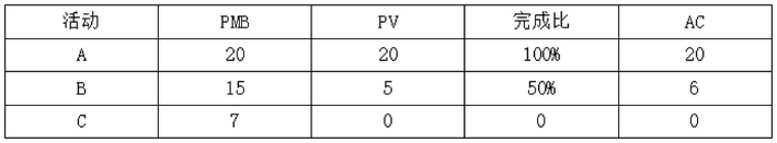 3、某软件开发项目包括A,B,C三项活动,目前各活动的相关数据如下(单位:万元),则该项目绩效处于()状态。