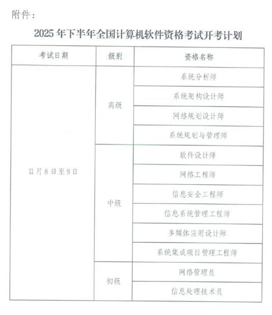 附件:2025年下半年全国计算机软件资格考试开考计划
