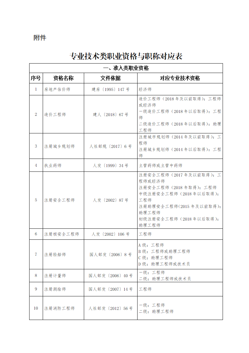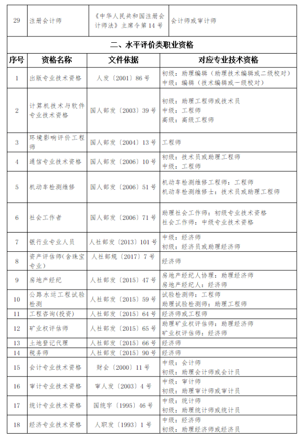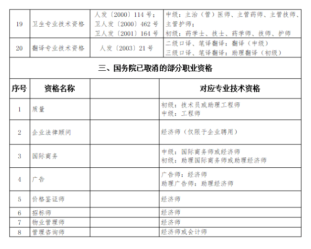 一、建立专业技术资格和职称对应关系。按照《专业技术类职业资格与职称对应表》(见附件),专业技术人员取得专业技术类所列职业资格,即可认定其具备相应系列和层级的职称,并可据此作为申报高一级职称的条件。国务院清理规范职业资格前,通过全国统一考试取得质量、企业法律顾问、国际商务、广告、价格鉴证、招标、物业管理、管理咨询等8项资格证书的人员,按照国家职业资格制度规定,原有职业资格仍可继续对应相应系列和层级职称。