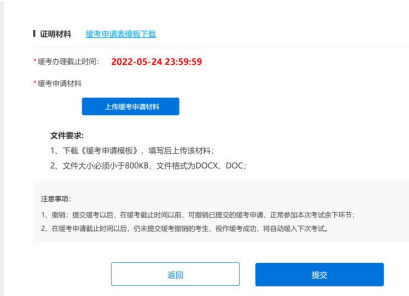 满足条件的考生点击“申请缓考”按钮并阅读缓考规则后,需根据模板编写缓考材料并将材料进行上传,材料上传完成点击“提交”按钮完成缓考申请。