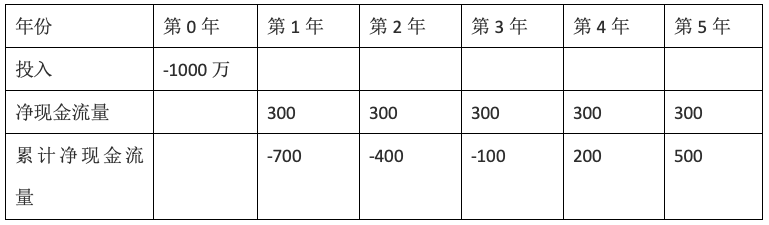 根据题干是年初投入1000万元,且年末有收益,把投入年记为第0年,从第1年到第5年每年年末都有净现金流量300万元,也就是每年都有收入300万。题目要求的静态回收期,为方便理解,画一个表格