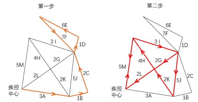 首先所有路径相加:5+4+2+3+2+2+3+5+1+2+1+6+7=43,返回疾控中心时需要重复的路径是多少,需要再加多少。为方便说明行驶的顺序,给各路径按照字母编号,写在公里数的后面,并分两步行驶完,用箭头标注。