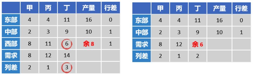 以较大差额同行或同列的最小运价为准,用其所在行的产量,较大限度满足所在列的需求。即西部余下的8吨全部运送到丁,运费8*6=48;西部产量用完,删除西部这一行,丁余下的需求为6。