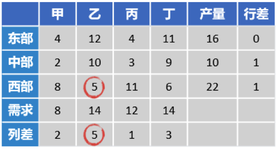 与较大差额同行或同列的最小运价为准,用其所在行的产量,较大限度满足所在列的需求。