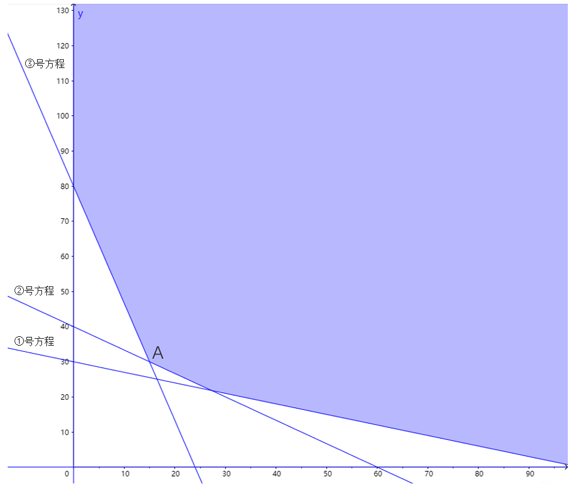 以-20/29为斜率的一族平行线,当z值由小变大时,直线沿其法线方向向右上方移动。当移动到达A点时,使z值在可行域边界上实现最小化,且满足所有的约束条件。从图上可以看出A点实际上是②③两个方程取等号时的解。即x=15,y=30。