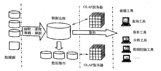 如下图。前端工具有查询工具、报表工具、分析工具、数据挖掘工具等。
